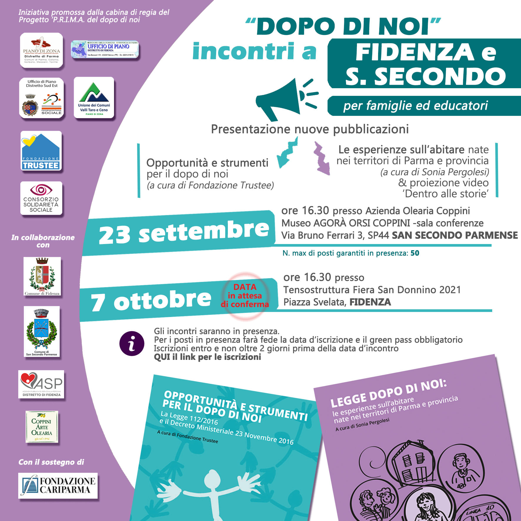 Gli incontri, sostenuti dal contributo di FONDAZIONE CARIPARMA, sono promossi dalla cabina di regia del Progetto 'P.R.I.M.A del dopo di noi': i quattro Uffici di Piano della provincia (Parma, Fidenza, Sud Est, Valli Taro e Ceno), Fondazione Trustee e Consorzio Solidarietà Sociale.
